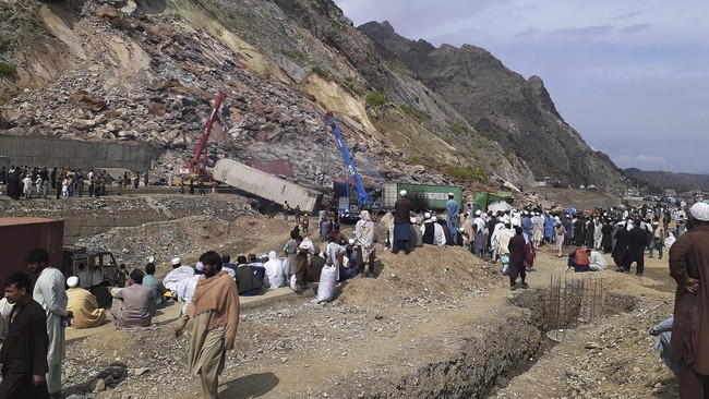 Torkham - Tanah longsor melanda jalan raya utama Torkham di barat laut Pakistan. Sedikitnya 10 hingga 15 truk dengan puluhan orang tertimbun tanah.