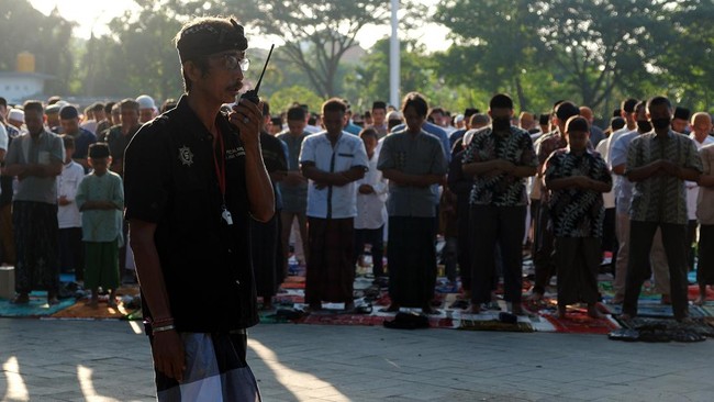Bali - Umat muslim di Bali melaksanakan salat Idul Fitri di Lapangan Lumintang, Denpasar, Sabtu (22/4/2023). Salat Idul Fitri ini dijaga oleh Pecalang.