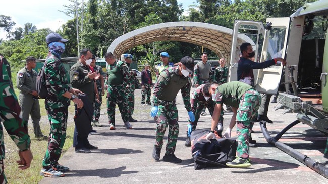 Papua - Prajurit TNI Pratu F gugur usai diserang KKB dalam operasi pencarian pilot Susi Air di Nduga, Papua Pegunungan. Jenazah Pratu F langsung dievakuasi ke Timika.