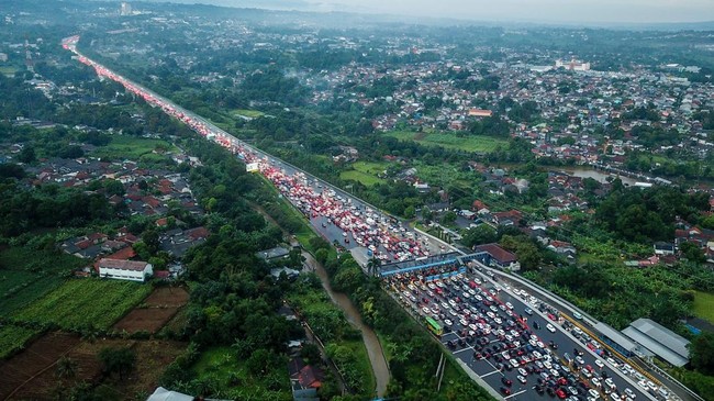 Bogor - Ribuan antrean kendaraan mengular di pintu keluar Tol Ciawi, Kabupaten Bogor, Jawa Barat, Minggu (23/4/2023). Ini foto-fotonya.