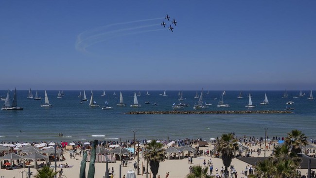 Tel Aviv - Dalam menandai HUT ke-75 Israel, warga berkumpul di tepi laut Mediterania di Tel Aviv, Israel untuk menonton aerobatik Angkatan Udara Israel. Begini momennya.