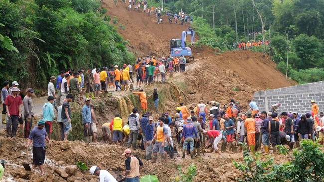 Wonosobo - Tanah longsor terjadi di desa Derongisor, Mojotengah, Wonosobo, Jawa Tengah Jumat (28/4/2023). Relawan dan tim SAR masih melakukan evakuasi.