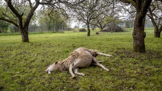 Seekor domba terbaring mati di bawah pohon padang rumput Wehrheim-Friedrichsthal dekat Frankfurt, Jerman, Selasa (2/5/2023). (AP Photo/Michael Probst)