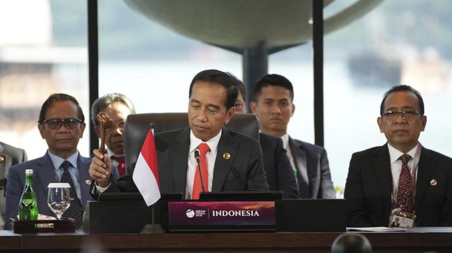 Presiden Indonesia Joko Widodo mengetok palu menandai dibukanya Konferensi Tingkat Tinggi (KTT) Ke-42 ASEAN, di Labuan Bajo, Manggarai Barat, NTT, Rabu (10/5/2023). (AP Photo/Achmad Ibrahim)