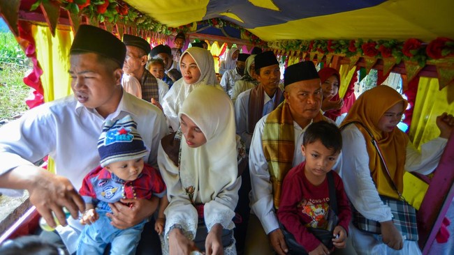 Padang - Sebanyak 18 pasangan mengikuti nikah massal yang digelar Pemkot Padang. Mereka diarak naik odong-odong lho gaes.