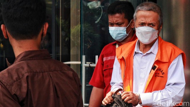 Sudrajad Dimyati meninggalkan gedung KPK Jakarta usai mengikuti sidang online sebagai terdakwa yang digelar Pengadilan Tipikor Jawa Barat.