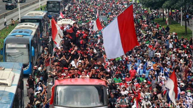 Bus rombongan kontingen Indonesia SEA Games 2023 itu sudah kembali menuju Bundaran HI, Jumat (19/5/2023).