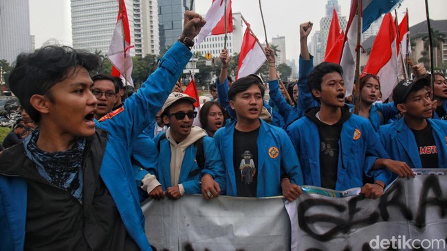 Jakarta - Dalam memperingati 25 tahun reformasi, massa mahasiswa melakukan aksi di kawasan Patung Kuda. Ini foto-fotonya.
