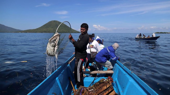 Jakarta - Sejumlah relawan menggelar aksi bersih-bersih sampah di perairan Ternate. Kegiatan itu sebagai upaya melindungi ekosistem perairan laut dari pencemaran sampah.