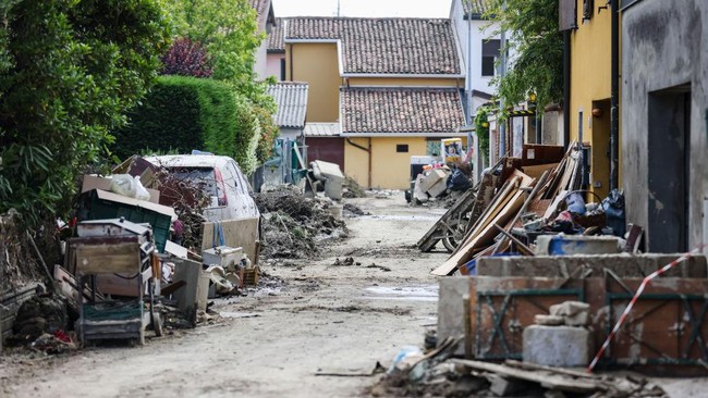 Penampakan barang-barang yang rusak tergeletak di depan rumah warga, di Sant'Agata Sul Santerno, Italia, Minggu (28/5/2023).