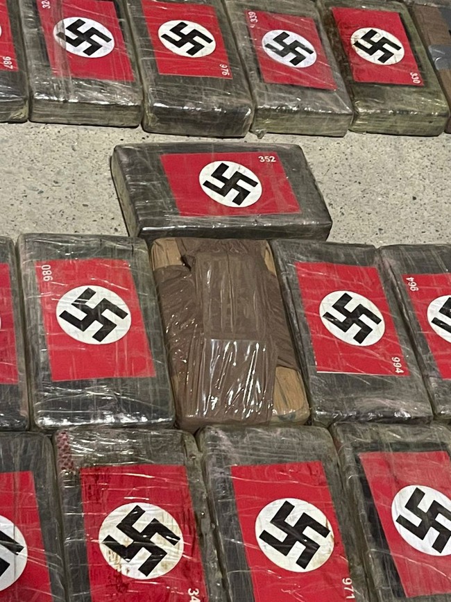 Peru - Polisi Anti Narkoba Peru menemukan kokain seberat 58 kilogram di pelabuhan. Kokain itu terbungkus dengan gambar bendera Nazi dan Hitler.