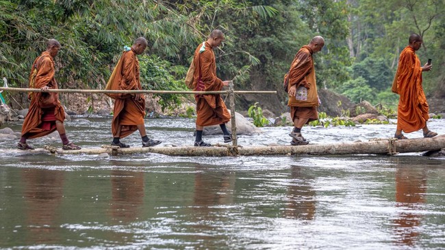 Sejumlah biksu yang mengikuti ritual Thudong menyeberangi Sungai Kaligarang untuk menuju ke Wihara 2500 Buddha Jayanti-Sima Sungai Kaligarang untuk menuju ke Wihara 2500 Buddha Jayanti-Sima di Bukit Kassapa Pudakpayung, Kota Semarang, Jawa Tengah, Senin (29/5/2023).