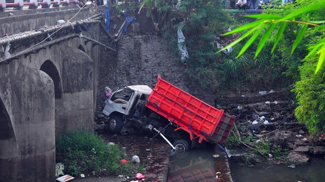 Kudus - Sebuah truk jatuh ke Sungai Logung di jalur pantura, Jekulo, Kudus, Jawa Tengah. Kecelakaan tunggal tersebut akibat pengemudi truk mengantuk.