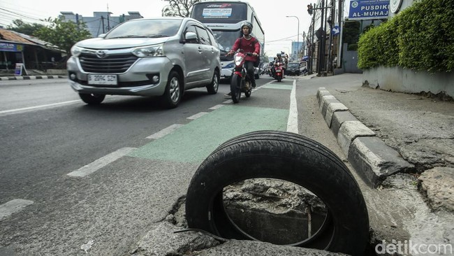 Pengendara melintas di samping gorong-gorong yang bolong karena penutupnya rusak di Jalan Cut Mutia, Kota Bekasi, Jawa Barat, Senin (5/6/2023).