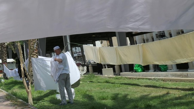 Seorang peserta ibadah haji dari China menjemur kain kafan di Kawasan Mahbaz Jin, Mekah, Arab Saudi, Selasa (6/6/2023).