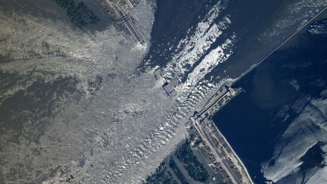 Ukraina - Bendungan era Uni Soviet di wilayah Ukraina jebol usai diguncang beberapa kali ledakan. Jebolnya bendungan itu memicu banjir di wilayah sekitarnya.