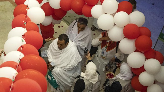 Arab Saudi - Calon jemaah haji kloter terakhir gelombang pertama telah tiba di Makkah. Balon warna merah putih turut menyemarakkan penyambutan calon jemaah haji.