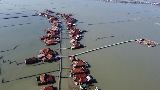 Demak - Akibat krisis iklim, sejumlah desa di pesisir utara Pulau Jawa tenggelam. Seperti Desa Timbulsloko, Demak, Jawa Tengah, ini yang terendam air laut pasang.