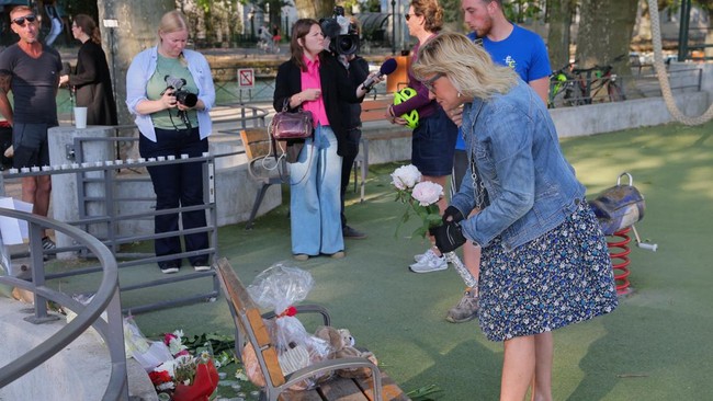 Seorang wanita meletakkan bunga di taman Le Paquier di dekat danau di Annecy, di French Alps, Prancis, Jumat (9/6/2023).