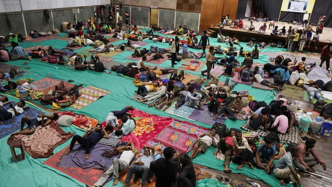 Orang-orang yang dievakuasi dari pelabuhan Kandla terbaring di dalam aula serbaguna otoritas pelabuhan yang diubah menjadi tempat berlindung, sebelum kedatangan topan Biparjoy, di Gandhidham, di negara bagian barat Gujarat, India, Selasa (13/6/2023). Pemerintah juga telah memperingatkan bahwa topan tersebut berpotensi membawa angin kencang berkecepatan 150 kilometer per jam ke arah pesisir pantai padat penduduk.