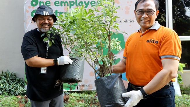 Direktur Utama PT Alita Praya Mitra, Teguh Prasetya (kanan) didampingi Head of Corporate Services PT Alita Praya Mitra, Bambang Andjar Prasetyono (kiri) melakukan penanaman pohon dalam rangka perayaan ulang tahun ke-28, dengan tema “One Employee, One Tree: Be the Inspiration, Green Environment Improvement is Our’s Responsibility”, di Jakarta, Kamis (15/6/2023).