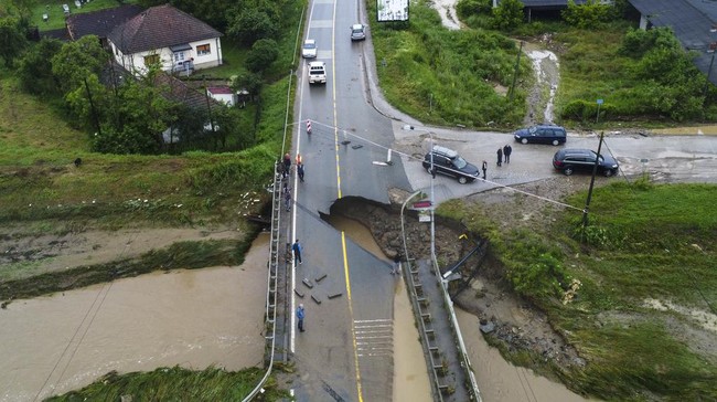 Serbia - Sebuah jembatan di Kota Adrani, Serbia, ambrol akibat diterjang banjir. Ini penampakannya.