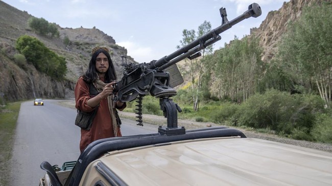 Seorang pejuang Taliban berjaga di belakang mobil pikap di sebuah jalan di provinsi Wardak, Afghanistan, Minggu (18/6/2023). (AP Photo/Ebrahim Noroozi)