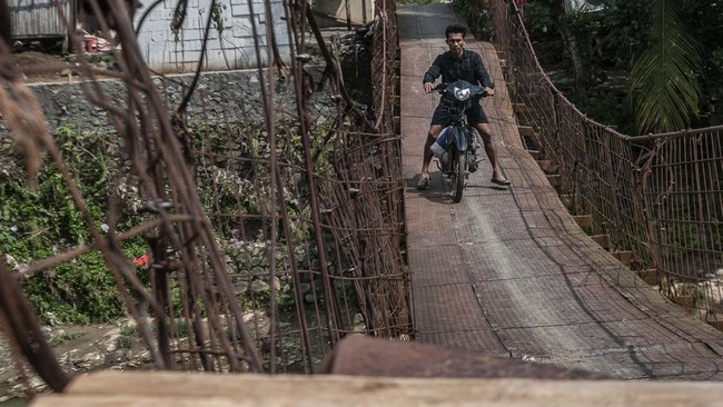 Potret Warga Nekat Lintasi Jembatan Gantung yang Rusak Parah di Lebak