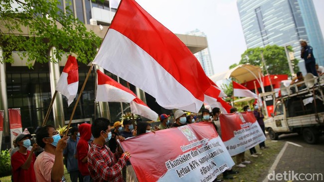 Jakarta - Massa yang tergabung dalam Relawan Indonesia Bersatu melakukan unjuk rasa di Gedung KPK, Jakarta. Massa meminta KPK usut tuntas kasus suap Sekretaris MA.