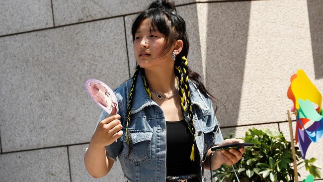 Seorang wanita menggunakan kipas angin di tengah peringatan merah untuk gelombang panas di Beijing, China, Jumat (23/6/2023). Beijing mencatat rekor baru hari terpanas di bulan Juni dalam lebih dari 60 tahun. Kota ini diterpa gelombang panas berkepanjangan dengan suhu ekstrem yang bertahan hingga akhir Juni.