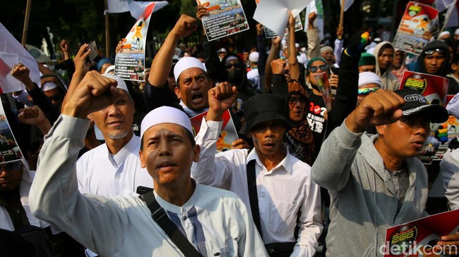 Jakarta - Massa Front Persaudaraan Islam (FPI) menggelar demo di Kemenag, Jakarta. Massa menuntut Kemenag mencabut izin dan menutup permanen pondok pesantren Al-Zaytun.