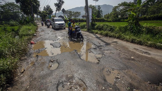 Bogor - Jalan akses menuju sejumlah tempat wisata di kawasan Puncak Dua dan akses perbatasan Cianjur rusak parah. Begini foto-fotonya.
