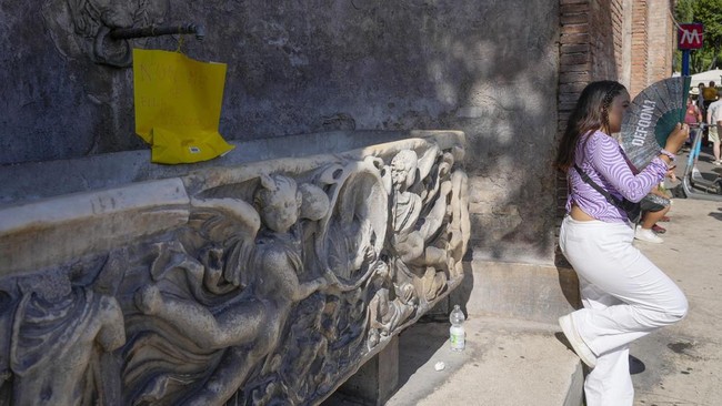 Seorang wanita berdiri di dekat air mancur kering dengan plakat bertuliskan dialek Romawi: "Tidak ada yang peduli padaku", menggunakan kipas angin untuk menghindari panasnya sore yang cerah di dekat Colosseum Roma, Italia, Rabu (5/7/2023).