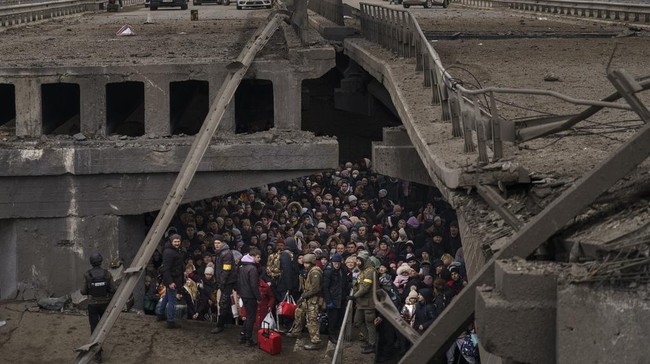 Warga Ukraina berkerumun di bawah jembatan yang hancur saat mereka mencoba melarikan diri dengan menyeberangi Sungai Irpin di pinggiran Kyiv, Ukraina, Sabtu, 5 Maret 2022. Sabtu (8/7) menandai 500 hari sejak Rusia menginvasi Ukraina pada 24 Februari 2022. AP/Emilio Morenatti