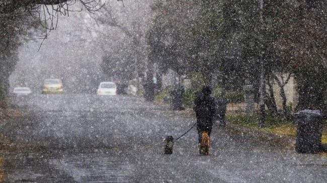 Seorang pria berjalan-jalan dengan anjingnya saat badai salju, di Johannesburg, Afrika Selatan, Senin (10/7/2023). (AP Photo/Jerome Delay)