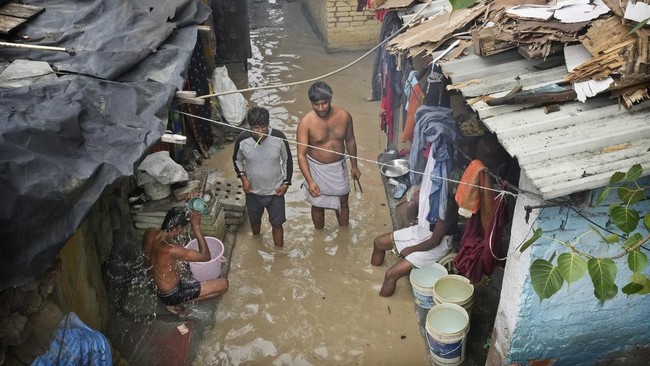 India - Hujan deras selama akhir pekan membuat Sungai Yamuna meluap. Akibatnya dataran rendah dan sebagian wilayah New Delhi kebanjiran.