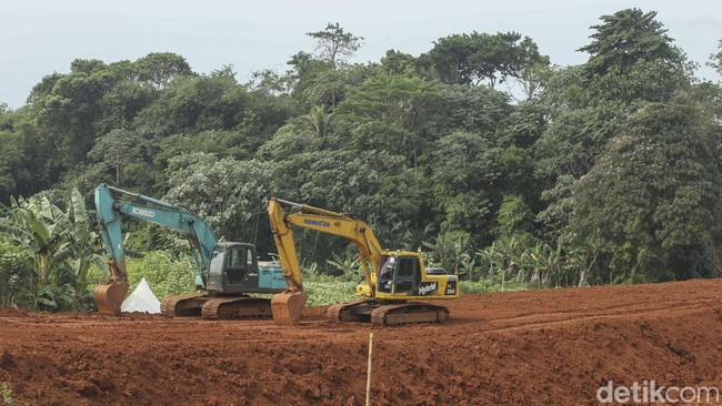 Dua alat berat atau eskavator beraktivitas di sisi timur Stadion Pakansari, Kabupaten Bogor, Jumat (14/7/2023).
