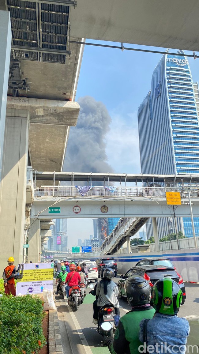 Jakarta - Menara K-Link di Jakarta Selatan (Jaksel) kebakaran. Asap hitam membubung tinggi ke langit.