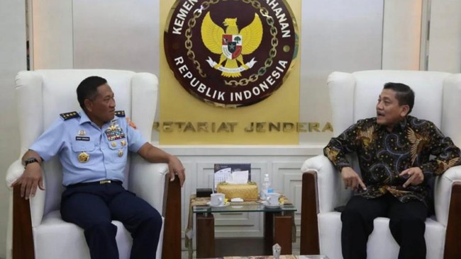 Sekretaris Jenderal Kementerian Pertahanan Marsdya TNI Donny Ermawan Taufanto menerima kunjungan Ketua Majelis Biro Klasifikasi Indonesia (BKI) Laksamana TNI (Purn) Marsetio di Kemhan, Jakarta, Selasa (11/7/2023). Dalam kunjungan tersebut, PT BKI sebagai BUMN Induk Holding ID Survey, memperkenalkan Sertifikasi berstandar Internasional bagi Produk Alutsista buatan industri pertahanan, khususnya Tentara Nasional Indonesia (TNI).
