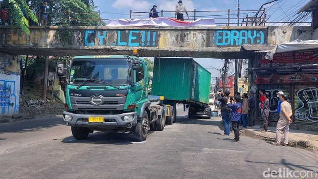 Bogor - Truk membawa kontainer tersangkut jembatan terjadi di Kota Bogor, Jawa Barat. Kontainer yang dibawa truk tersebut menimpa mobil yang melaju di belakangnya.