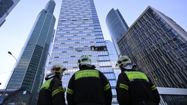Pemandangan gedung pencakar langit yang rusak di kawasan bisnis "Moscow City" setelah serangan drone yang dilaporkan terjadi di Moskow, Rusia, Minggu dini hari, 30 Juli 2023. Serangan tersebut sempat membuat bandara internasional tutup sementara.
