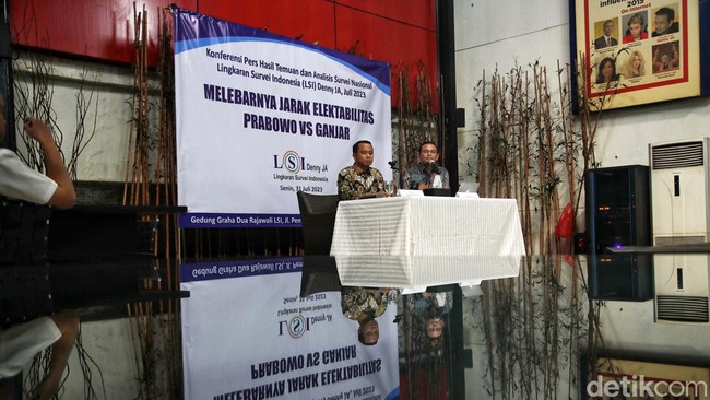 Jakarta - LSI Denny JA merilis hasil survei head to head bakal capres Prabowo Subianto dan Ganjar Pranowo, Senin (31/7/2023). Prabowo dan Ganjar berjarak 10,4 persen.