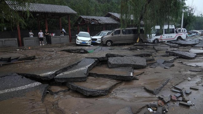 Beijing - Banjir yang dipicu oleh Topan Doksuri membuat jalanan di Beijing rusak. Bahkan aspal di sebagian ruas jalan mengelupas akibat terjangan banjir.