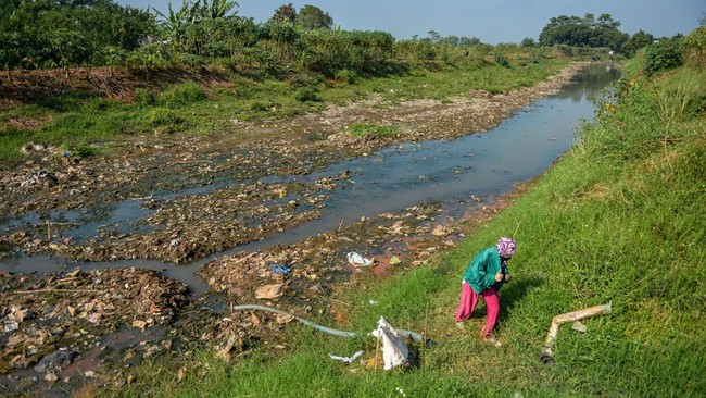 Warga berjalan di bantaran Sungai Cikeruh yang mengering di Tegalluar, Kabupaten Bandung, Jawa Barat, Jumat (4/8/2023).