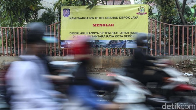 Depok - Warga di sekitar Jalan Nusantara, Depok, Jawa Barat, menolak sistem satu arah yang bakal diberlakukan. Spanduk penolakan terpajang di sepanjang jalan.