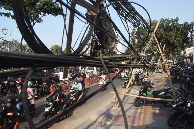 Bekasi - Kesemrawutan penataan kabel utilitas tak hanya terjadi di Ibu Kota Jakarta. Di Kota penyangga seperti Bekasi juga menjadi PR bersama, Hati-hati melintas!