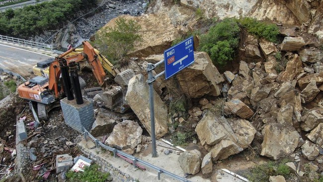 Dalam foto yang dirilis oleh Kantor Berita Xinhua ini, alat-alat berat mengangkat bebatuan yang jatuh di jalan setelah hujan badai di Kota Shijiaying, Distrik Fangshan di pinggiran Beijing pada Minggu, 6 Agustus 2023. Banyak orang termasuk penyelamat tewas dalam banjir baru-baru ini di ibu kota China, dan banyak lainnya hilang. AP/Ju Huanzong