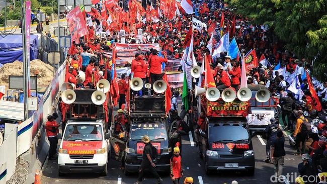 Jakarta - Massa buruh melakukan long march menuju kawasan Patung Kuda, Jakarta Pusat, Kamis (10/8/2023). Aksi itu untuk menolak UU Ciptaker.