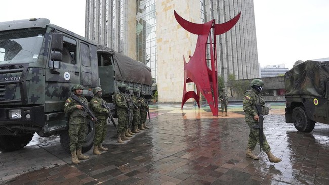 Tentara menjaga area dekat kantor TV Ekuador, tempat debat presiden akan diadakan di Quito, Ekuador, Minggu (13/8/2023).