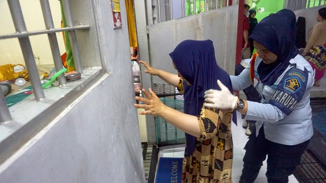 Petugas menggeledah warga binaan pemasyarakatan saat razia di Lembaga Pemasyarakatan (Lapas) Perempuan Kelas III UPT Kanwil Kemenkumham Gorontalo.